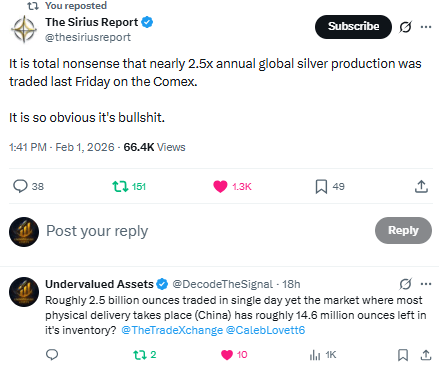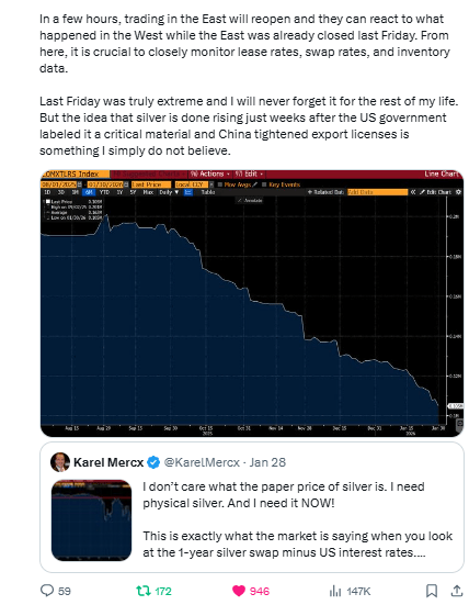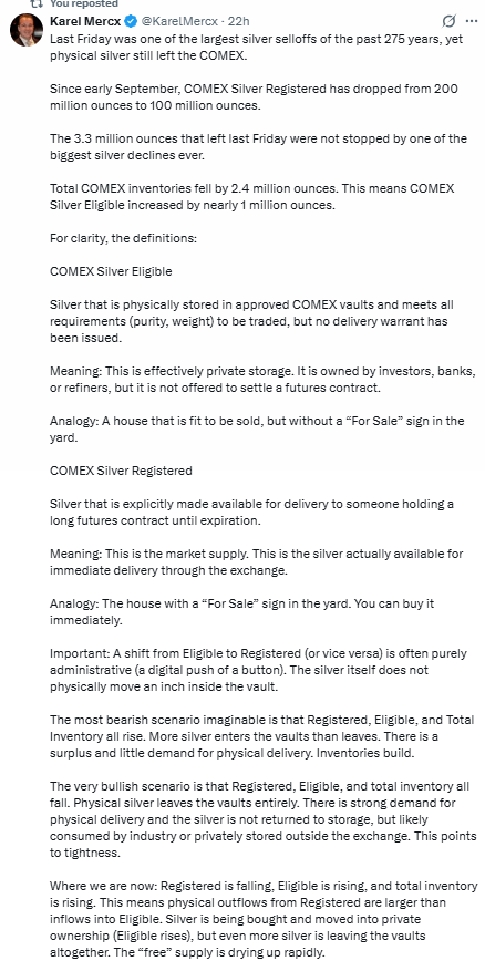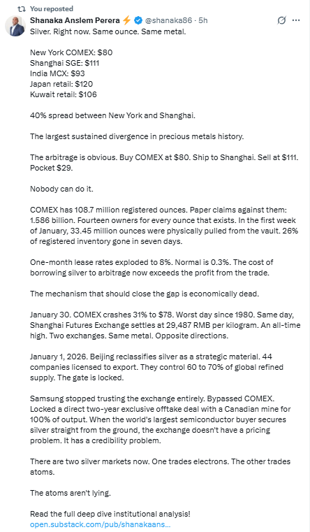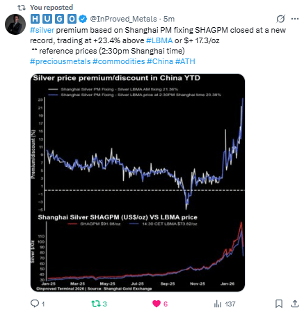- 2.5× annual global silver production traded in one day, Shanghai silver premium blows out to record highs, COMEX silver available for delivery continues to decline, Silver backwardation (scarcity indicator) persists despite a sell off of statistically impossible magnitude