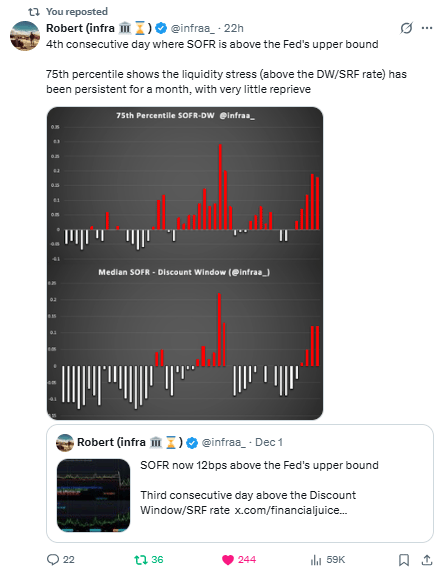 When overnight rates trade above the policy ceiling (and even above the SRF/Discount Window), it means balance sheets and good collateral are scarce.