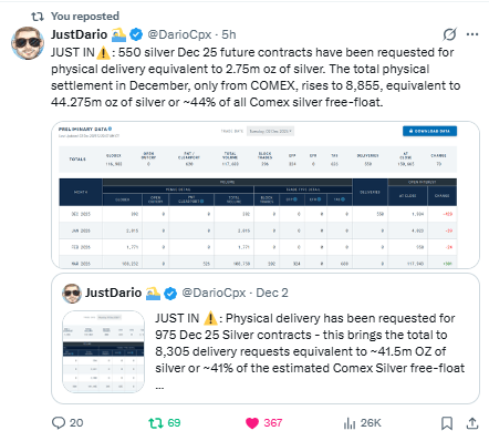 December physical requests now total ~8,855 contracts (~44.3 Moz) — roughly ~44% of the estimated free-float for the month.