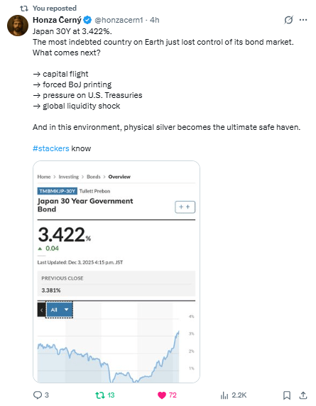 Japan’s 30-year ripping to ~3.4% isn’t a local blip—it kicks the legs out from the yen carry trade and puts the biggest foreign holder of U.S. Treasuries (Japan) at the center of the storm.