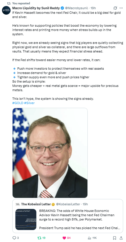 Collateral is failing in plain sight—COMEX silver is being claimed, MBS is in triage, yen carry is snapping, and SOFR is screaming—so capital is sprinting to base-layer money: gold for security, silver for upside. Don't worry, a dovish Fed chair will get all this back on the right track.