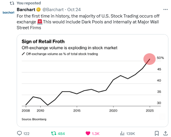 Off-exchange dominance is a late-cycle tell. Enjoy the calm fills, but plan for the day the lights matter again.