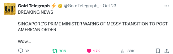 Positive read-through: multipolar competition pushes real-asset collateral (gold/monetary silver), local-currency rails, and redundancy in payments. In a world built on LEVERAGE, the side holding the base layer sets the rules. The speech is the diplomatic version of what markets are already whispering.