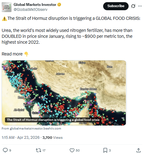 Six hours ago: urea has doubled, and the global food chain is one nitrogen squeeze from a crisis the IMF hasn't modeled.