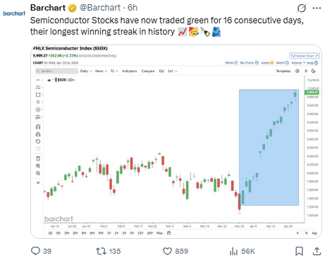 And the SOX just printed its longest winning streak in history — sixteen green sessions in a row.