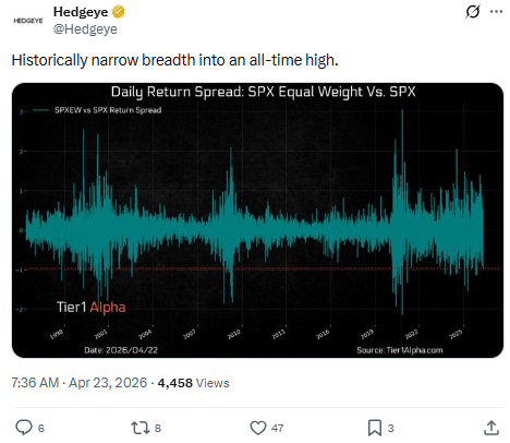 Sixteen green sessions in semis, all-time highs in the S&P, the narrowest breadth on record, and spreads starting to bleed.