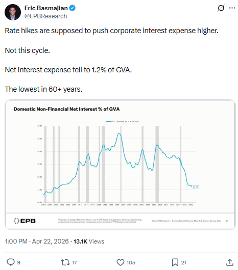 Eric Basmajian gave us the one stat that explains why it has held this long: corporate net interest expense just fell to 1.2% of gross value added — the lowest in sixty-plus years.