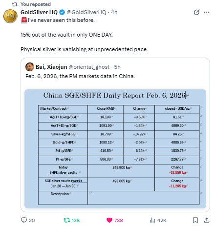On February 6, 11,285 kg (~362,800 oz) of silver physically left SHFE.