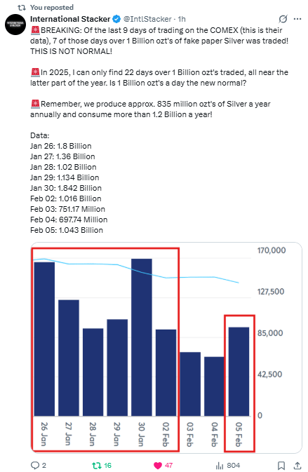 You don’t trade 1.8 billion oz of paper silver in a day when global annual production is ~835 million oz unless something is deeply wrong.