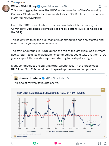 The Willem Middelkoop and Ronnie Stoeferle posts show that commodities are historically undervalued relative to the S&P 500, and that a multi-decade bull cycle could just be starting.