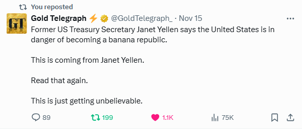 So when someone like Yellen is publicly allowed to use “banana republic” language and whispers about gold-backed bonds, the message is simple: