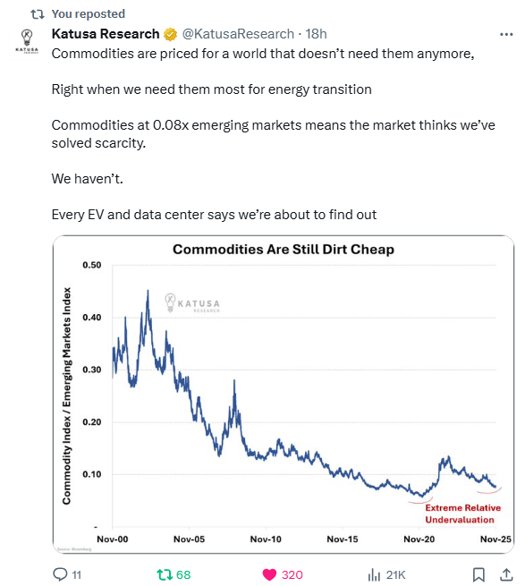 Commodities at 0.08x EM equities is the market saying: