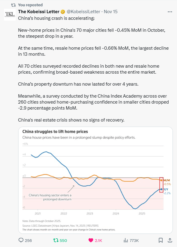LBMA is practically living hand-to-mouth on COMEX with effectively zero free-float silver while the metal has sat in backwardation since Oct 2; at the same time China’s housing bust has dragged on for 4+ years with new-home prices −0.45% MoM, resales −0.66% MoM across all 70 major cities, global commodities change hands at just 0.08× emerging-market equities, and former U.S. Treasury Secretary Janet Yellen is openly warning the United States is “in danger of becoming a banana republic.”