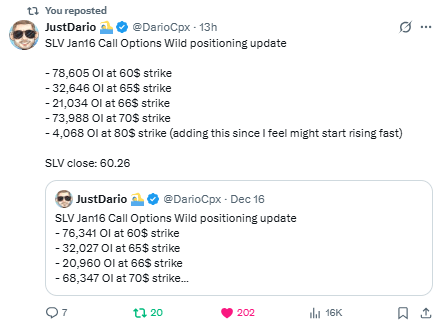 - Expect Asia To Pull Silver Up At Least Another $2.50 Or So In The Short Term, SLV Call Positioning Increasingly Bullish On Short-Term Upside, Mainstream Financial Media Starting To Ditch Bitcoin Pumps For Silver, China's Silver Export Restrictions Begin January 1st