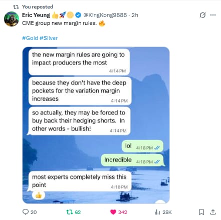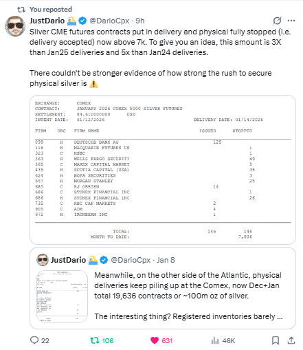 They get margin-called out of their short hedges, which forces them to cover — triggering more buying pressure...right when physical silver is evaporating off the shelves, China is flashing $93+ pricing, and deliveries are surging across global exchanges.