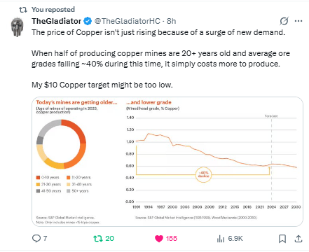 When 50% of copper mines are over 20 years old and average ore grades have collapsed by 40%, that’s not a “cost problem.”