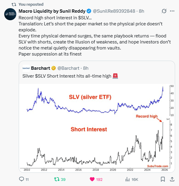 From record SLV short interest to repo panic, scarce reserves, and China locking down silver exports — every signal screams the same truth: the system is stretched thin. Funding costs are spiking, balance sheets are full, and policymakers are guessing where “ample” ends. Paper leverage is hitting its natural limit — and physical assets are quietly reclaiming power.