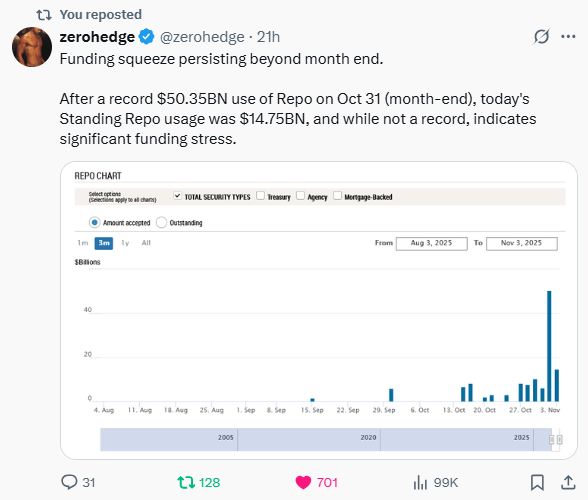 This isn’t panic—it’s physics. When every dollar is already spoken for, even a small squeeze feels like a punch. The price of cash goes up, leverage gets forced out, and liquidity becomes truth again.