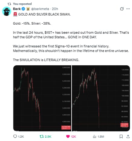 "In the last 24 hours...half of the GDP of the United States" was liquidated from gold and silver. "We just witnessed the first Sigma-10 event in financial history. Mathematically, this shouldn't happen in the lifetime of the entire universe."