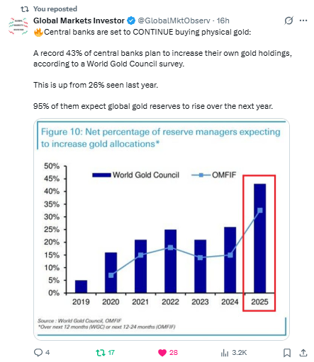 Translation: they expect softer real rates, currency dilution, and sanction/settlement risk ahead, so they’re rotating reserves into base-layer collateral that no one can print or freeze.