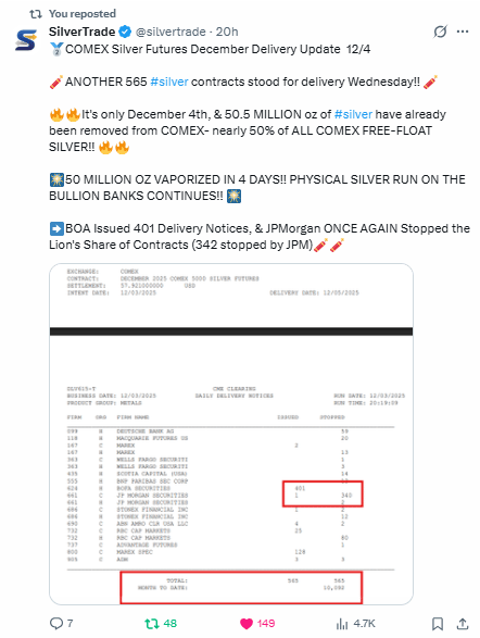 Half the COMEX free-float gone by Dec 4 = a real, physical run—not just paper shuffling.