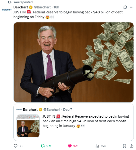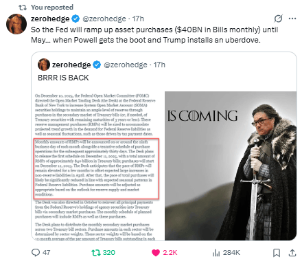 QE Begins With Markets At All-Time Highs, Shiller PE Hits New All Time Record, Fed Begins Buying 40 Billion In Treasuries On Friday, "Uberdove" Arrives In May, 7 Fed Officials See No Cuts In 2026 (No Chance), And Silver Rips To Another All Time High