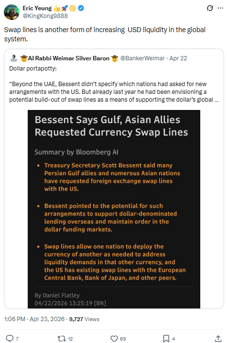 And underneath it all — Eric Yeung spotted it at 2 PM: "Swap lines is another form of increasing USD liquidity in the global system."