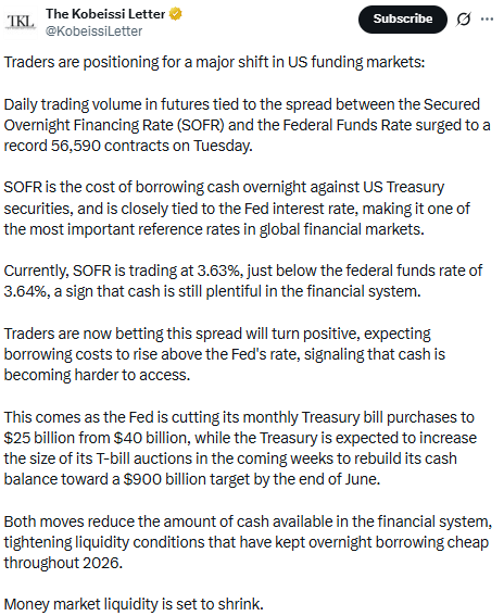 - Record SOFR Spread Volume, Swap Lines Being Pre-Wired, and $25B Month-End Equity Selling: The Plumbing Is Easing While the Narrative Still Says Tight