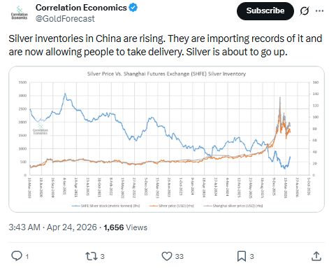 Tie this back to the Shanghai premium we’ve been tracking ($11 over London, EFPs inverted, Deutsche Bank's house account stopping 442 of 480 April silver notices): Western paper is feeding Eastern physical, and they're cutting margins to make it easier to do it again.