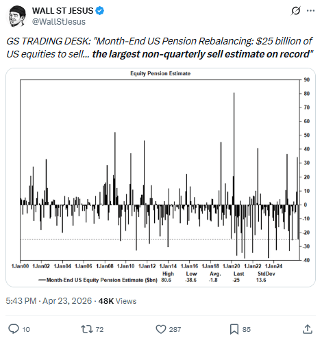 Goldman's pension-rebalance desk: $25B of US equities to sell into month-end — the largest non-quarterly sell estimate on record.