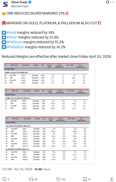 Then the mechanical tell: CME cut silver margins 21.4%, gold 14%, platinum 15.3%, palladium 14.2%.