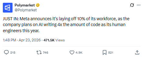 Meta laying off 10% — "AI will write 4x the code" — so the AI capex boom is simultaneously the thing holding up the multiple AND the thing gutting the labor market funding the multiple.