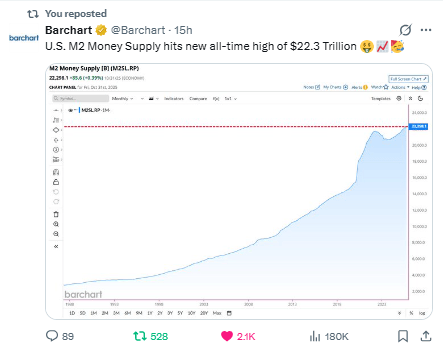 When rates cut but real yields won’t obey, capital flees paper; shorts grab bars, retail is waking up—silver leads the revaluation. M2 Money Supply makes yet another new all time high.