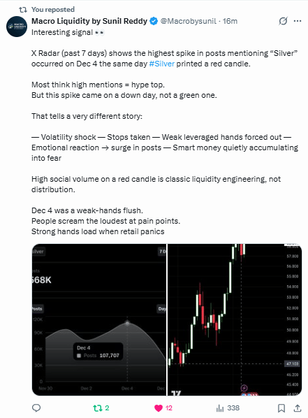Spike in “silver” mentions on a red candle = weak-hands flush, not a top.