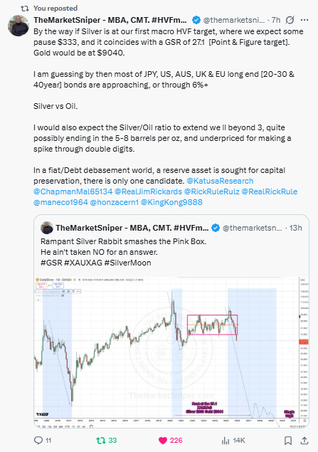 If silver hits his first macro target (~$333) with a gold/silver ratio near 27, gold would be ~$9,040—classic GSR compression you only see in regime shifts.