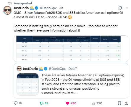 The street is under-hedged to that path. If silver keeps grinding up, gamma flips, vega expands, skew steepens—and those calls become accelerants.