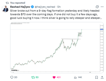 Silver Primed To Head Towards $70 & Eventually Beyond $333 As Silver February Call Options Nearly Double And 9-Day Flag Formation Broken, Golden Fibonacci Extension Suggests $71 for SLV, Global Debt Reaches $345.7 Trillion - 310% of Global GDP
