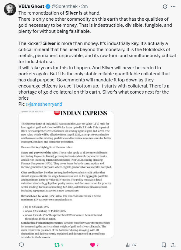 India is letting banks lend against silver (alongside gold) with clear LTV rules. In a world drowning in LEVERAGE, making silver acceptable collateral does three big things at once: