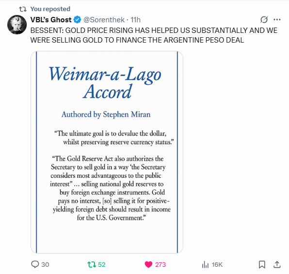 Translation: Washington is willing to use the nation’s bullion like a liquidity sponge—let gold reprice up (quiet dollar devaluation), then swap a slice into interest-bearing foreign assets to grease geopolitics.