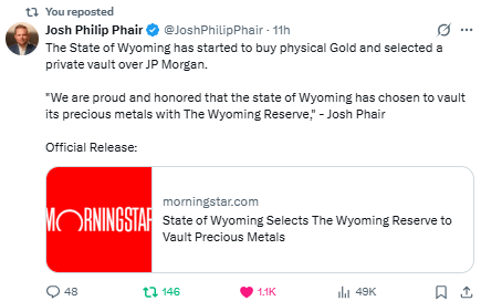 A U.S. sovereign subunit is refusing to use big bank custody (e.g., JP Morgan) and storing physical precious metals independently.