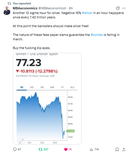 The magnitude and velocity of that silver price move — dubbed a "12-sigma" event — mathematically implies it should happen once every few trillion years.
