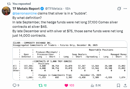 - Silver's Multi-Year Structural Deficit Finally Forcing Price Higher, Silver Price Trading 7.55% Higher In China, Chinese Silver Inventories Getting Critically Low, COMEX Silver Longs Were Halved From September to December