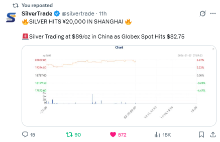 Silver just hit ¥20,000 in Shanghai (Jan 6th) — that's $89/oz in China vs $82.75 in the West.