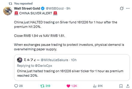 A 20% premium to NAV means buyers in China were willing to pay far above “paper” value just to secure silver exposure—classic sign that physical demand is outrunning available float and local arbitrage can’t fill the gap fast enough.