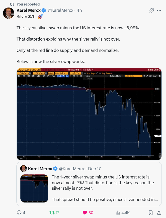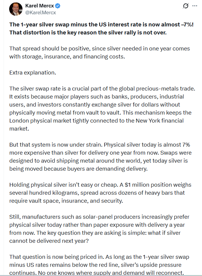 The 1-yr silver swap minus U.S. rates has cratered to ~-7%—a level that should be impossible in a calm market because carrying silver for a year (storage/insurance/financing) normally makes that spread positive.