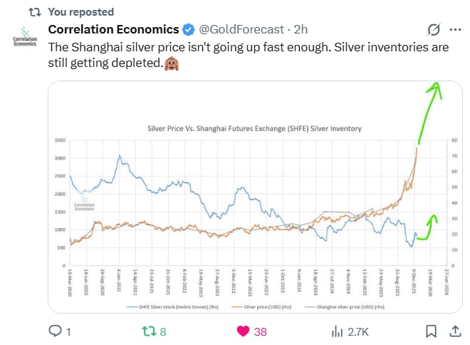 Shanghai silver screaming into the $80s while COMEX sits low-$70s = a breakout premium that forces U.S. price to chase.