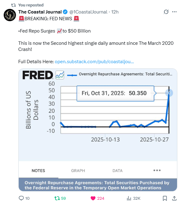 The repo market is the heart of global liquidity. When its heartbeat jumps like this, it’s the system saying: too much leverage, not enough cash.
