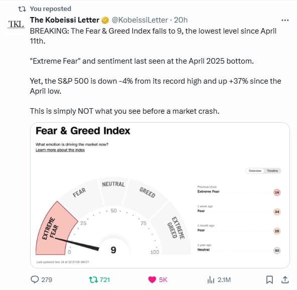 Extreme Fear at 9 while the S&P is barely down is the giveaway: