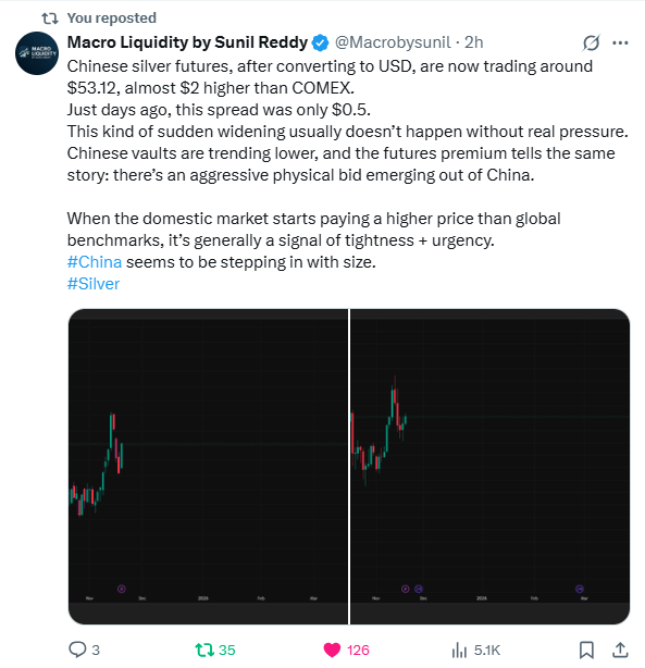 Chinese silver futures are now about $53.12, almost $2 ABOVE COMEX, and that gap blew out from just 50¢ a few days ago.