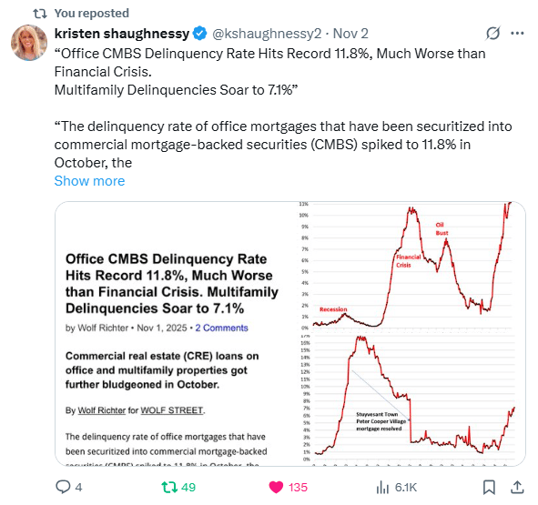 Office/Multifamily delinquencies spiking = leverage meeting reality